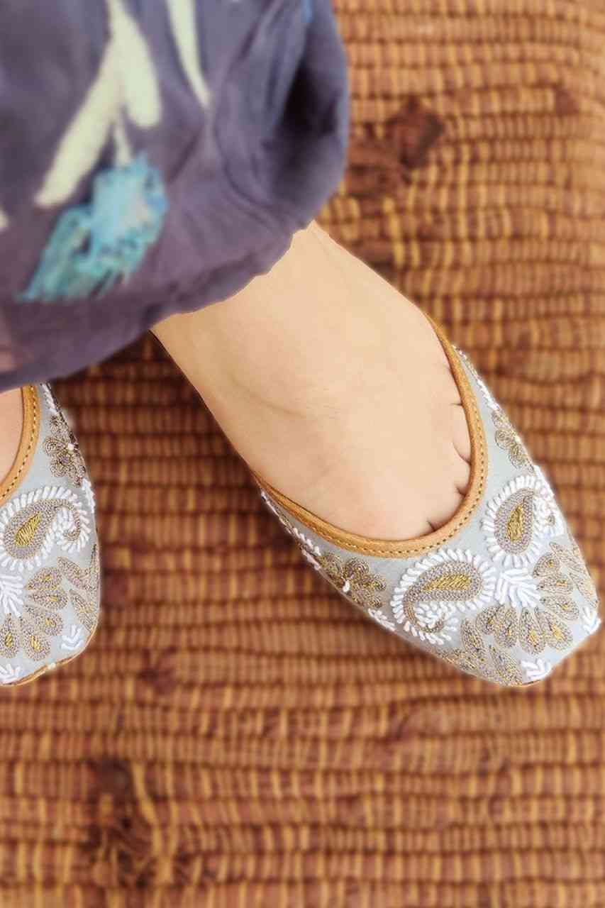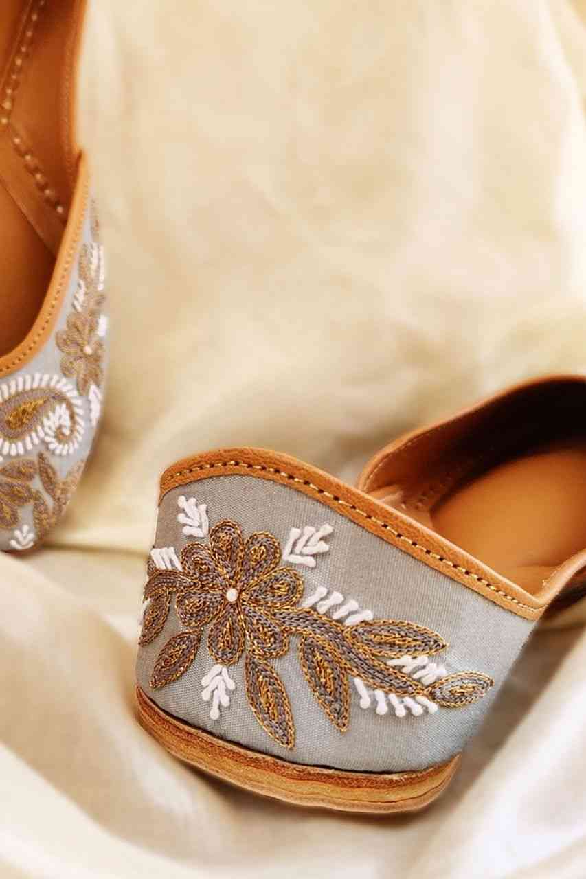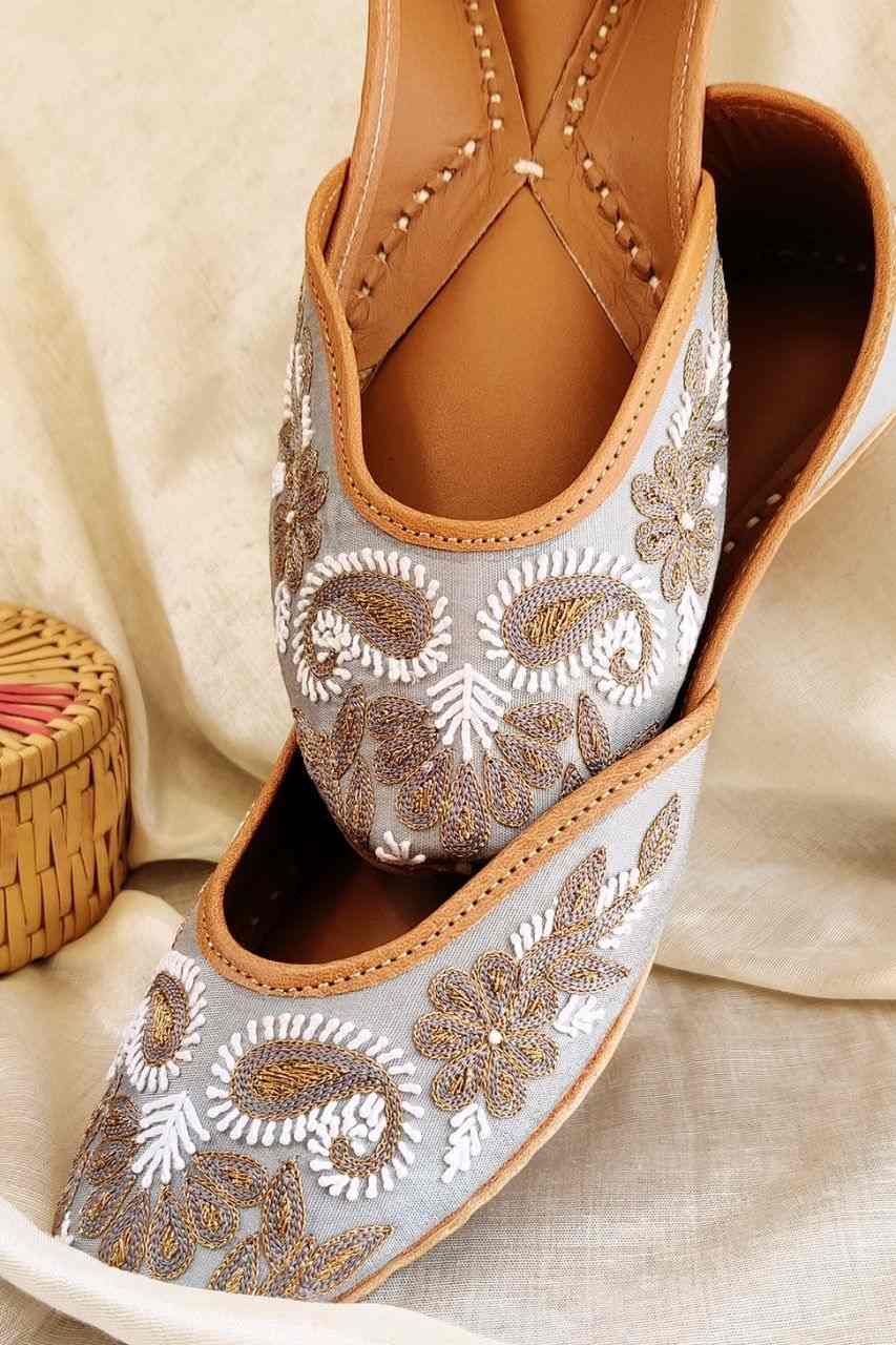 Bela juti for women perfectly accentuated the intricacy of needlework, beautified with patterns inspired from the age old craft of Chikankari. Bela features paisleys and florals, which bring out the subtle tone of gray in the most graceful way.