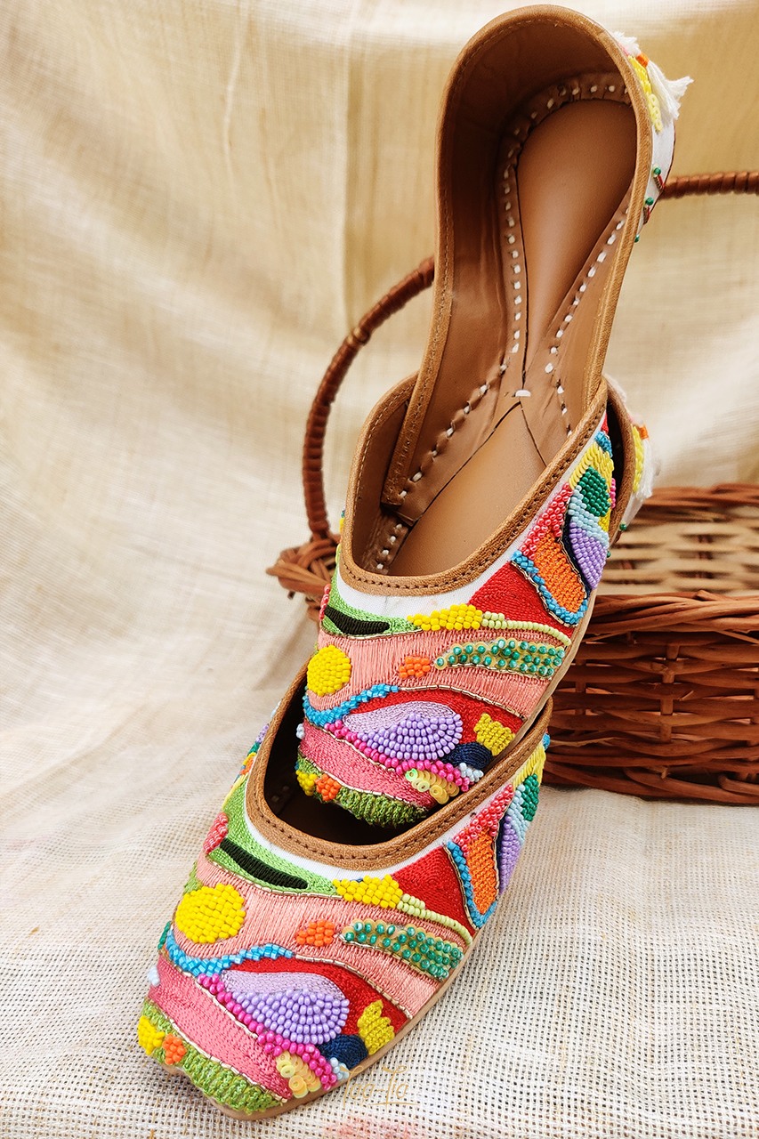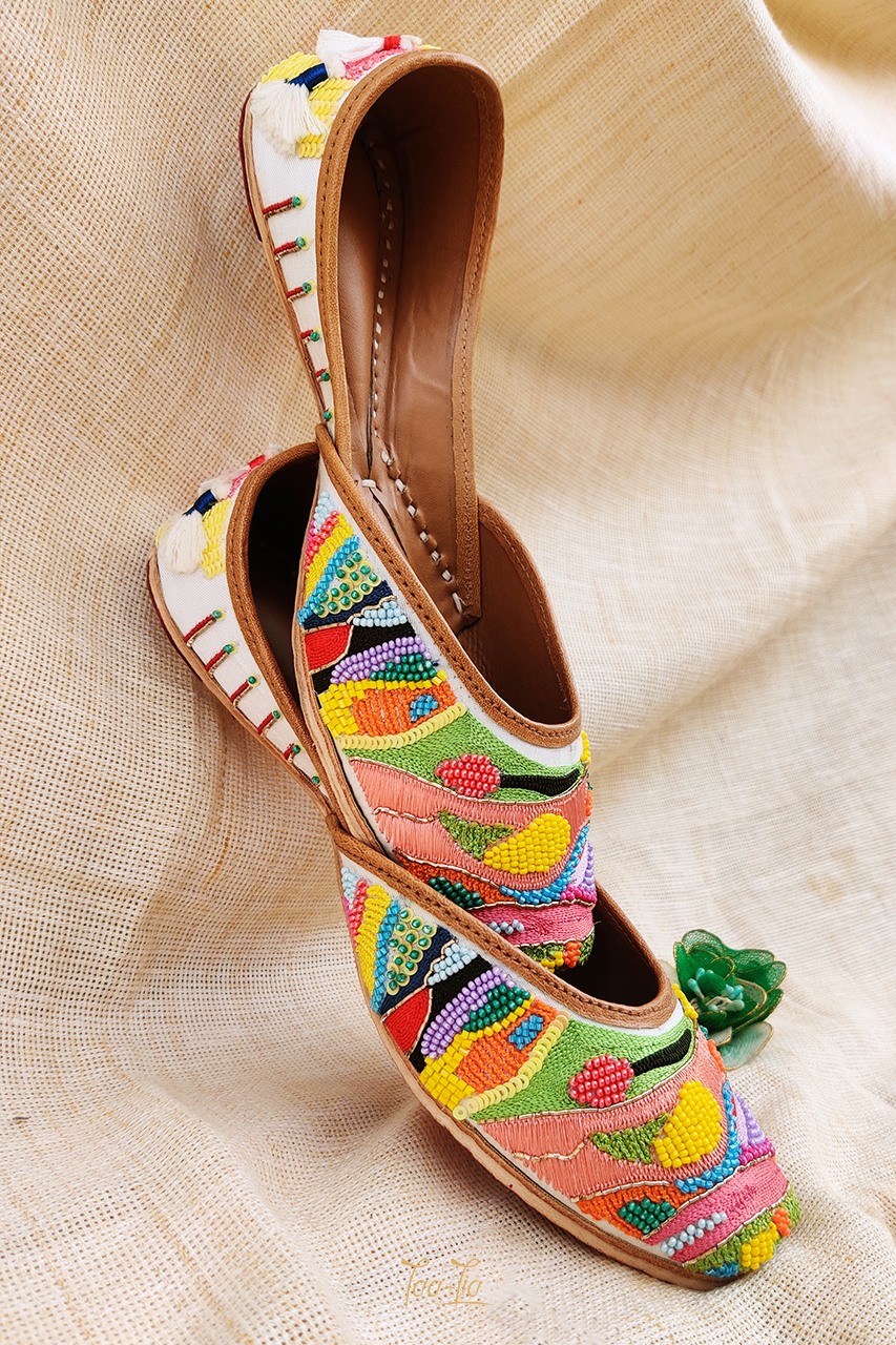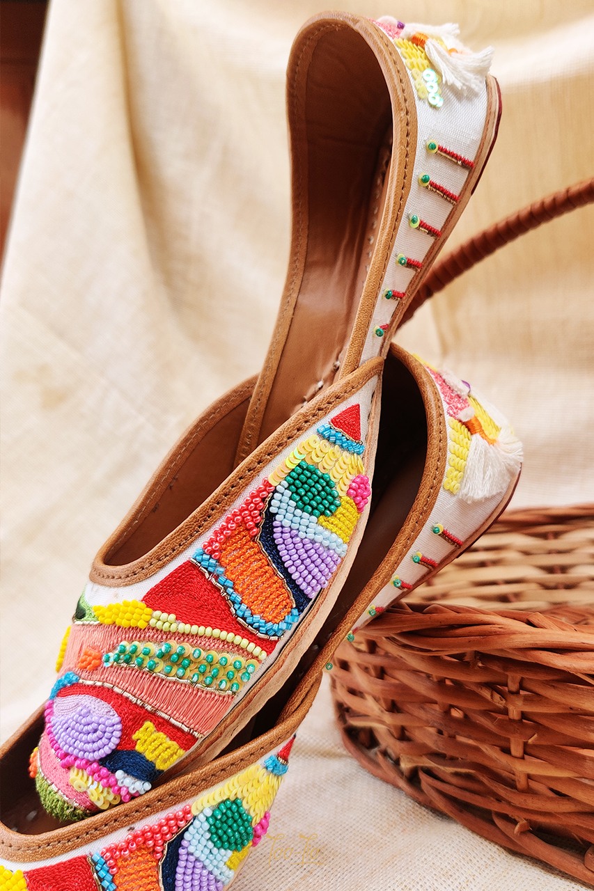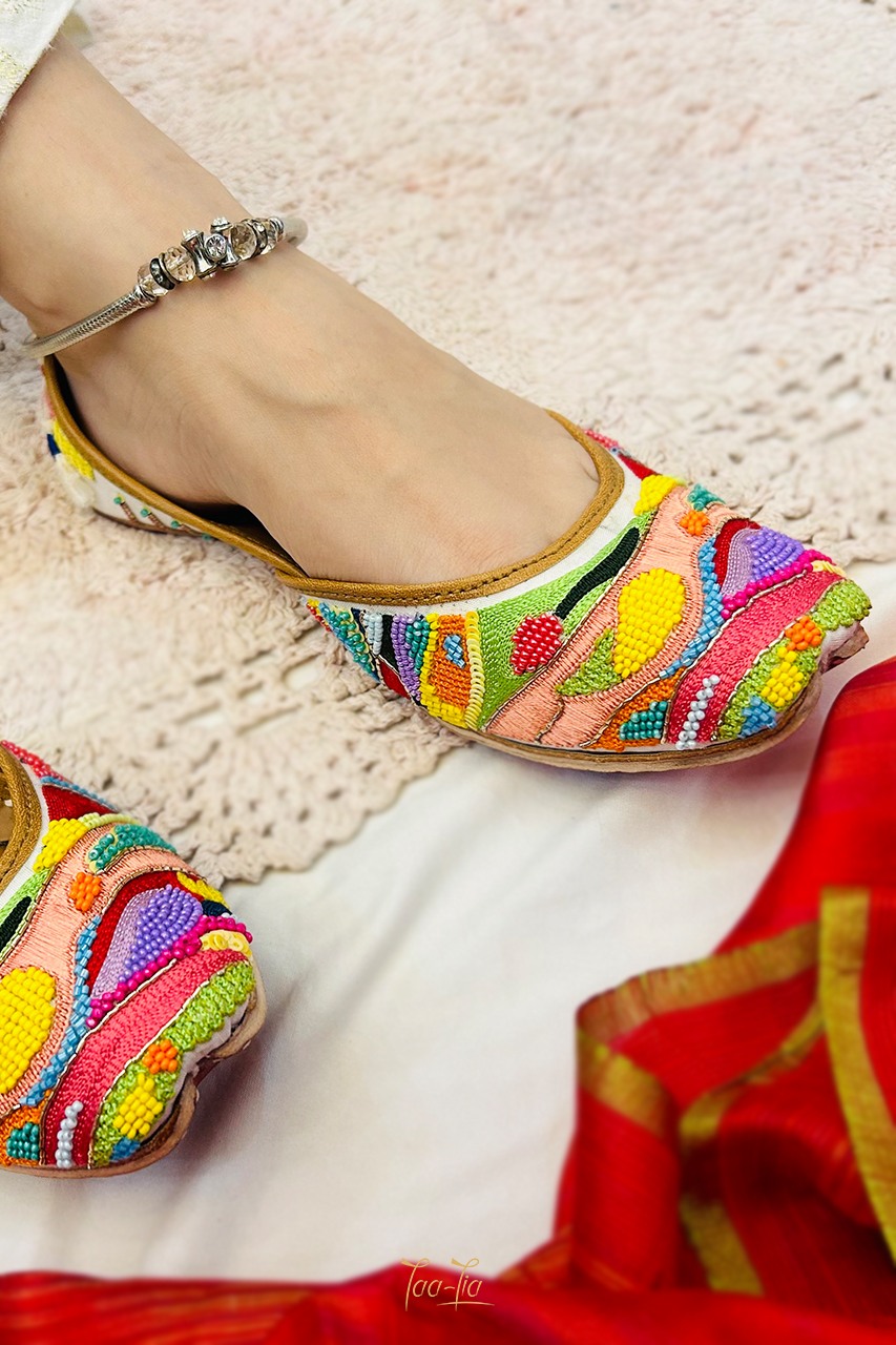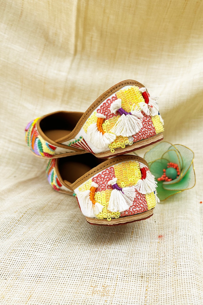 VATIKA, a delightful fusion of colors and textures that resembles a blooming field of flowers. These juttis are adorned with a vibrant and colorful abstract pattern, reminiscent of a lush flower bed in full bloom. Each pair is meticulously embellished with sequins, pearls, and a touch of dabka, adding a hint of sparkle and glamour to the design. But what truly makes Vatika stand out is the playful tassel detail at the back, adding a fun and whimsical touch to the juttis.