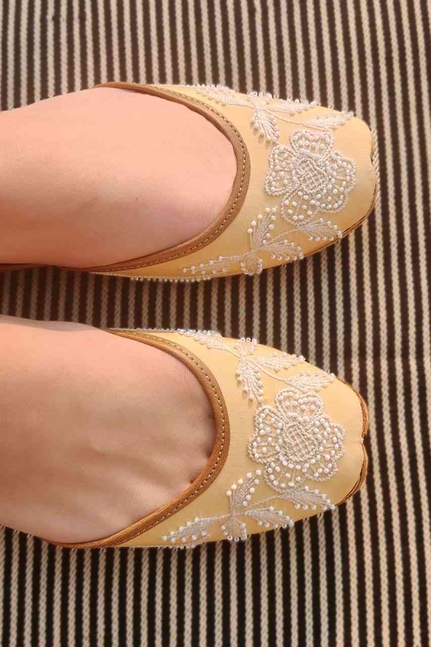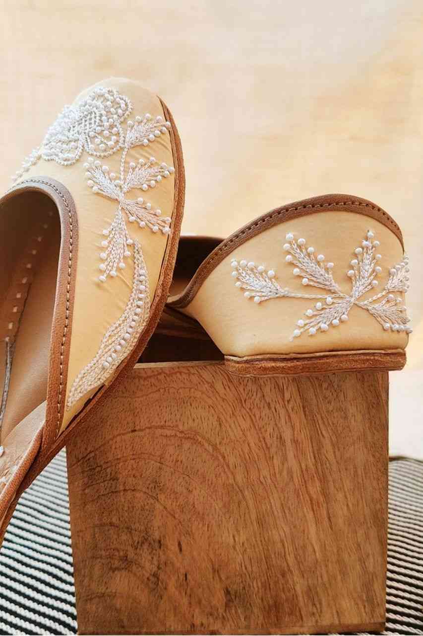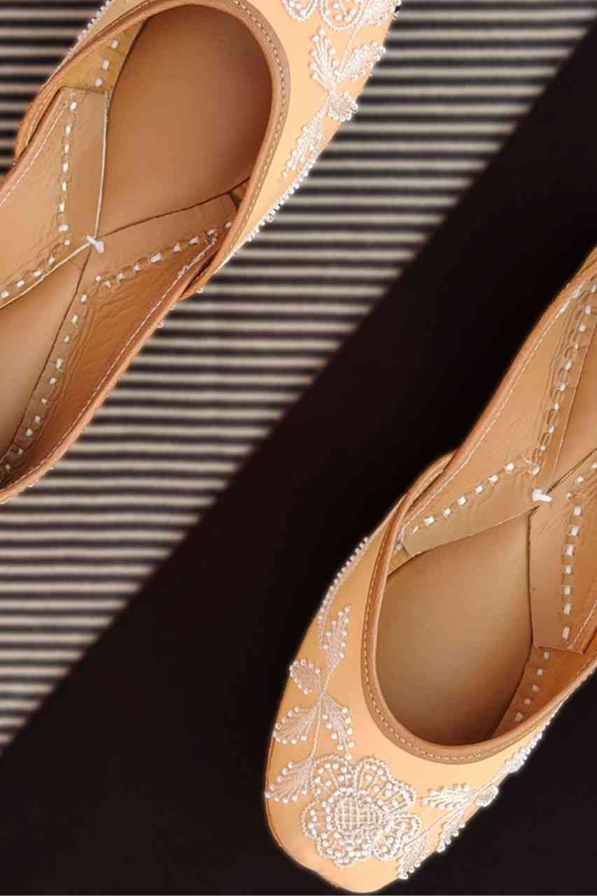 Gohar Punjabi jutti for women with gleaming pearls stitched into a pattern of intricate florals, with a pastel peach color perfectly complementing the calmness of each solitary pearl.