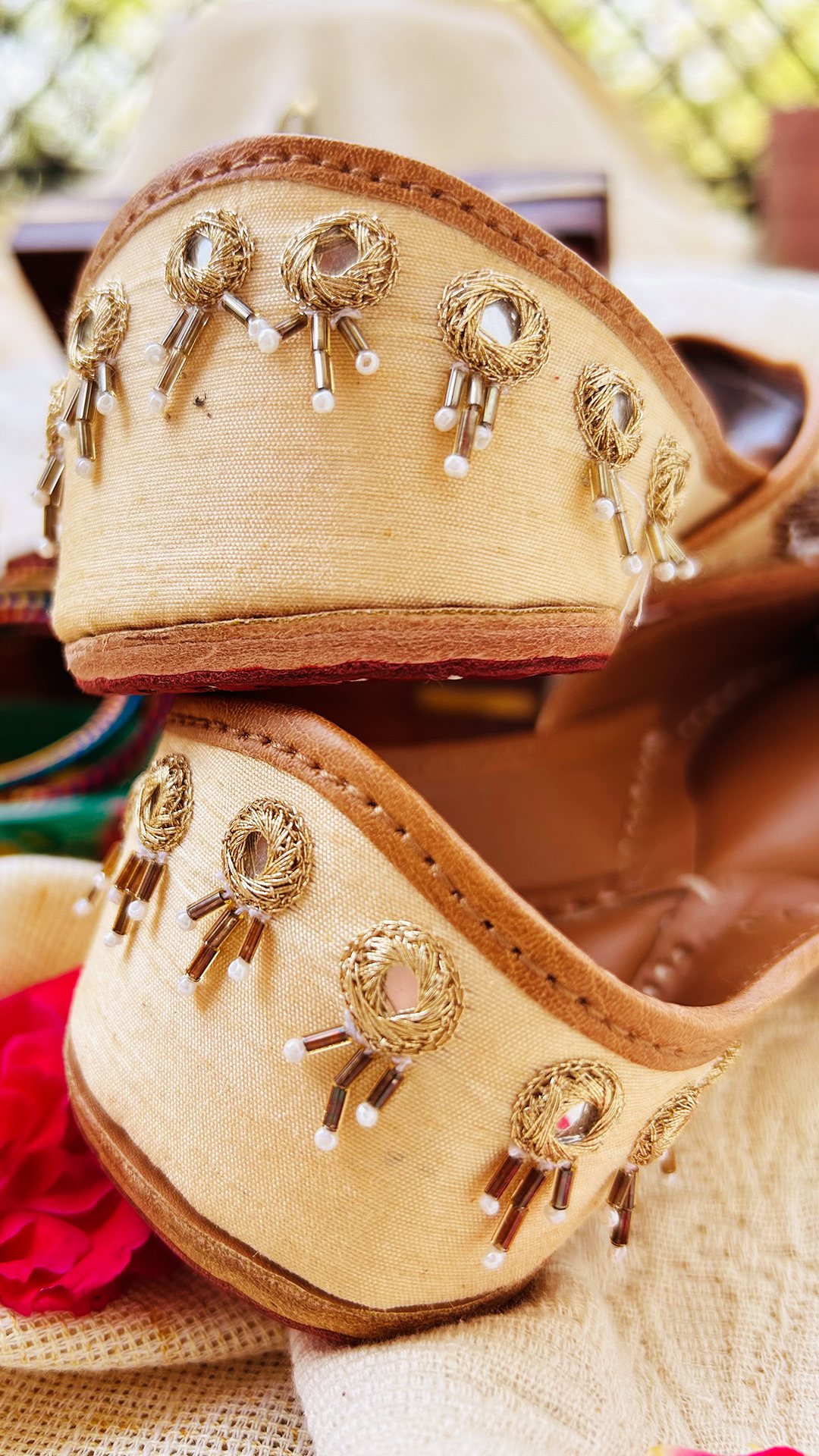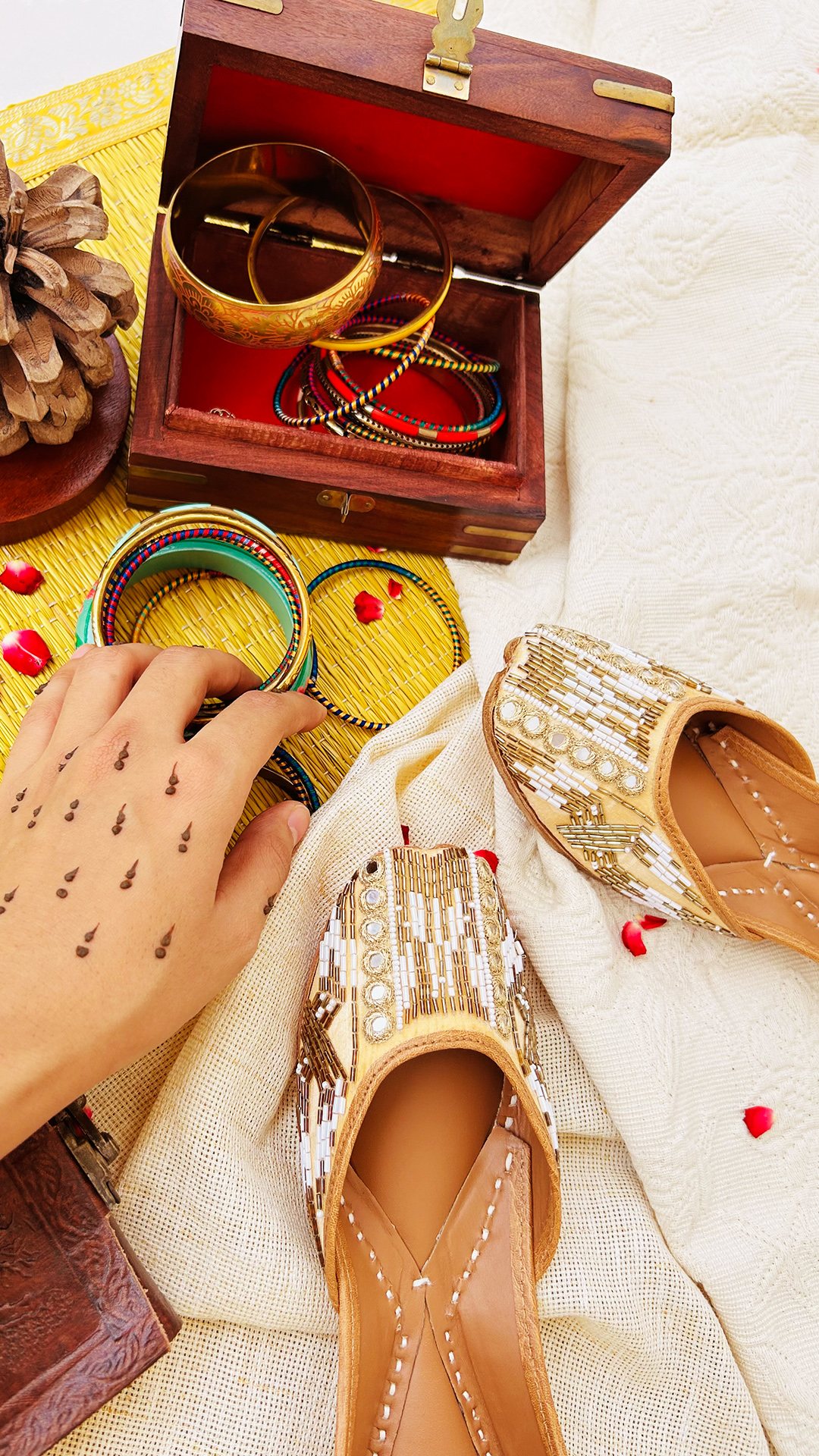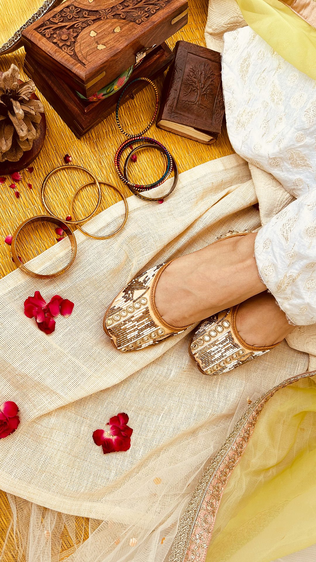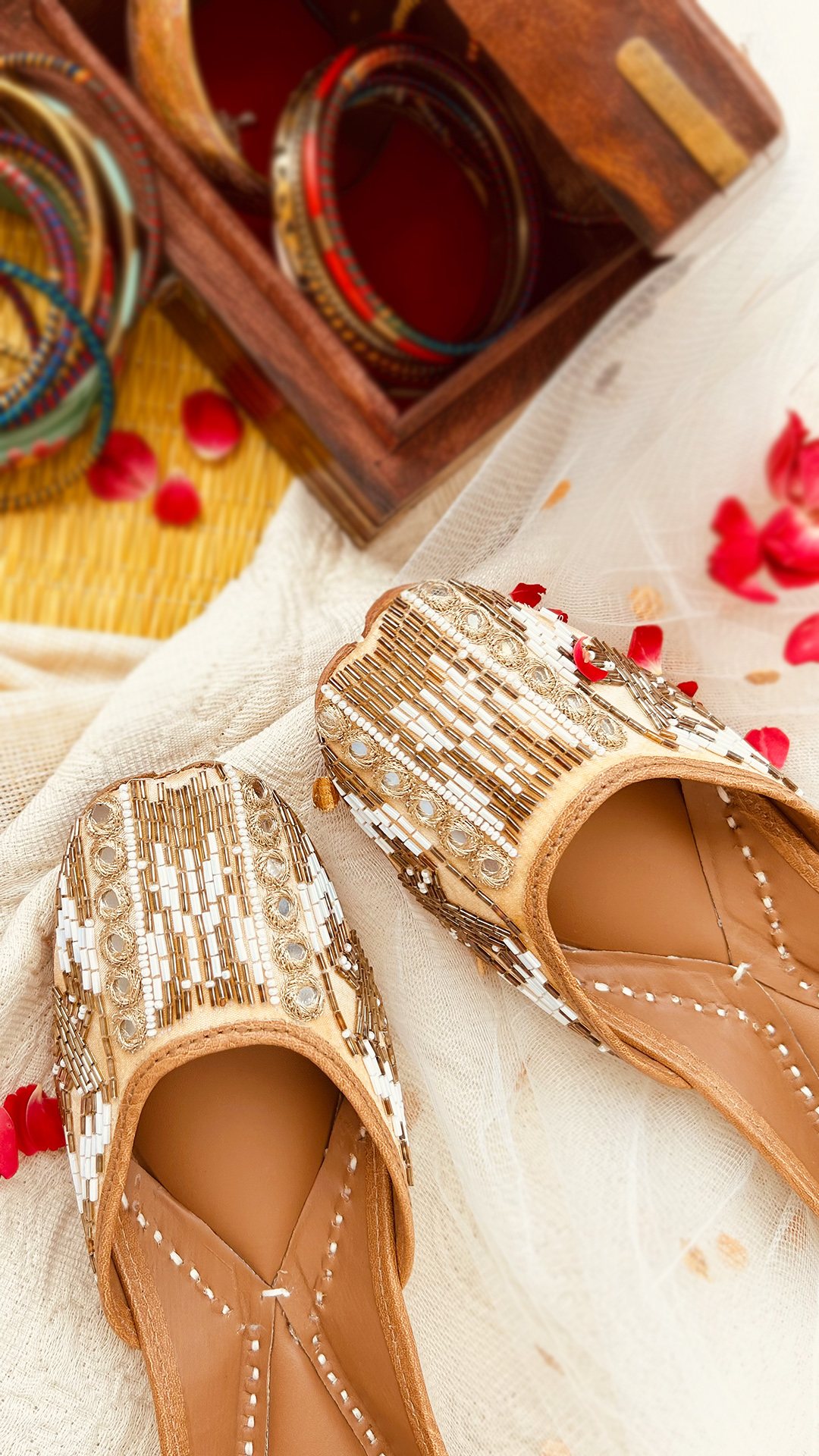 ROOH, featuring intricate mirror work, adorned with shimmering golden glass beads and delicate white pearls, all brought together with intricate golden zari detailing in a linear pattern. Every aspect of Rooh is meticulously crafted to perfection, resulting in a design that exudes elegance and sophistication. But what truly sets Rooh apart is the addition of a charming tassel adorned with mirror work at the back, adding a touch of whimsy and personality to the design.