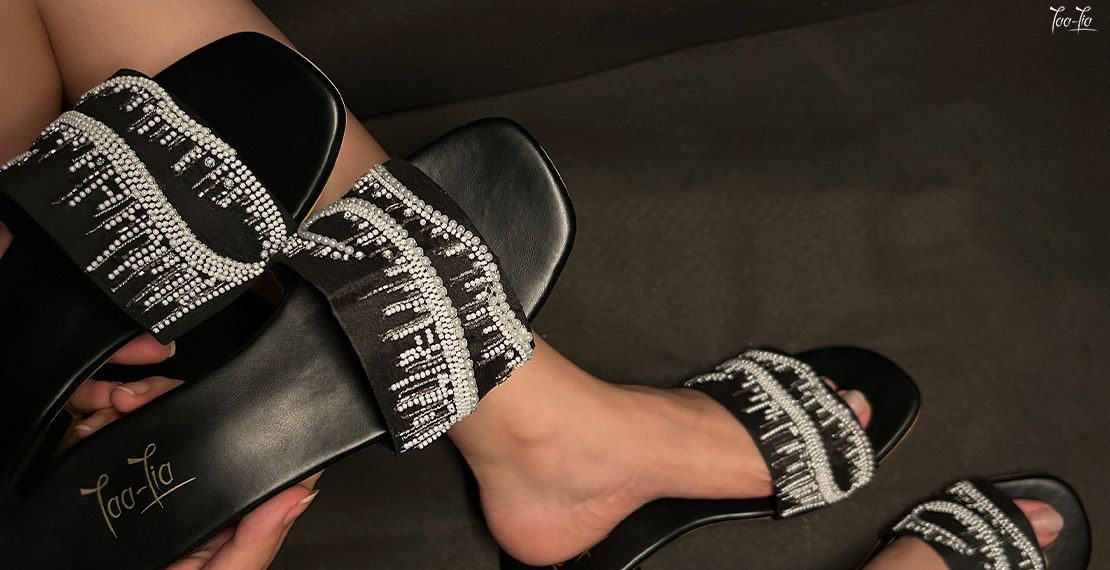The Starry Night Sandals feature an intricate abstract constellation design meticulously embroidered with pearls and silver zari on a sleek black base. This combination creates a stunning contrast, making the pearls and zari shimmer like stars against the dark sky. The delicate embroidery work captures the essence of a starry night, bringing a touch of celestial magic to your footwear.